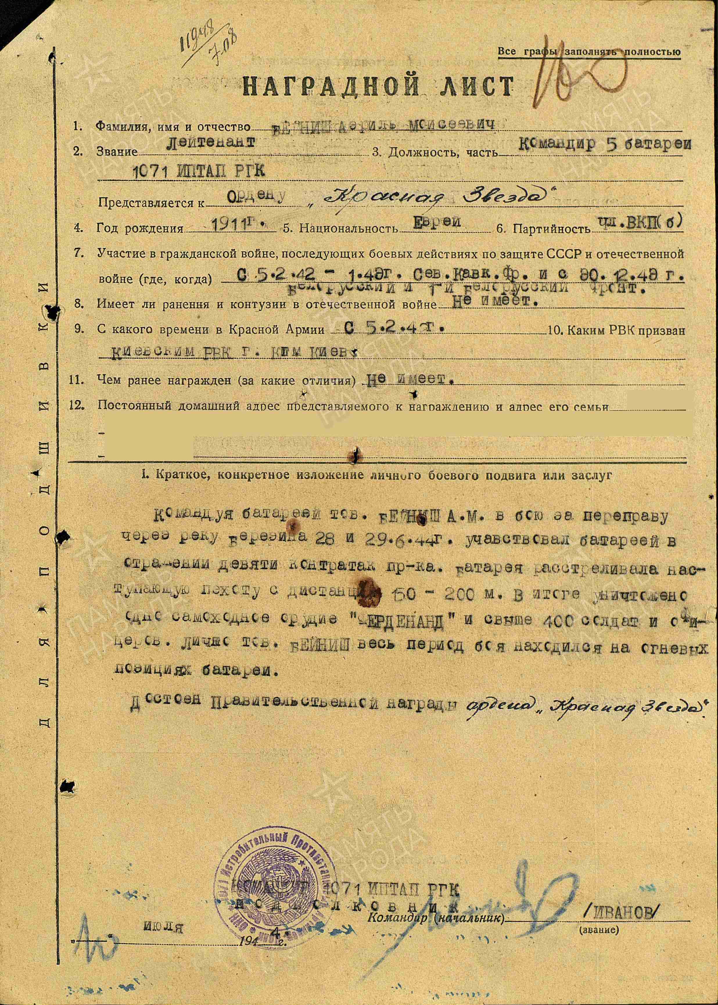 Утром, ещё в темноте, тягачи с пушками 1071-го истребительно-противотанкового артполка разместились на правом берегу реки. Здесь, за переправой, получили приказ: «Установить пушки на прямую наводку…» Три батареи полка заняли место на полевой дороге, что вела к большаку, а рядом с деревней Щатково – пятая батарея лейтенанта А.М.Бейниша.