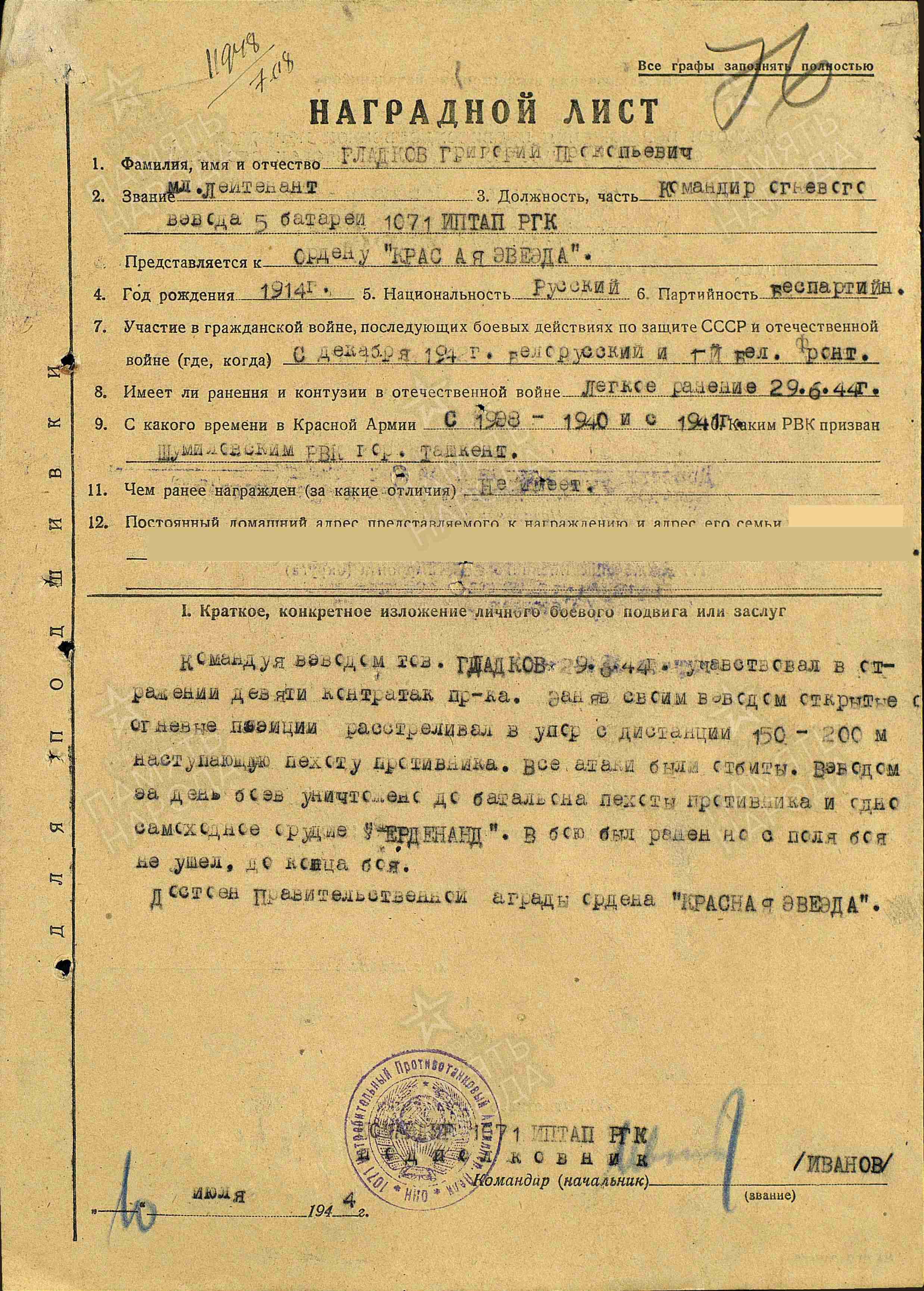 И вот уже вновь раз за разом прицельно стреляет пушка. Между тем сопротивление врага не слабнет. Немецкая пехота при поддержке пулемётов рвётся к Березине. А тут, как на зло, закончились осколочные снаряды. Гладков немного отошёл от пушки и взял автомат Безгина. В этот момент пулемётная очередь попала в плечо офицера. На гимнастёрке он увидел кровавое пятно.